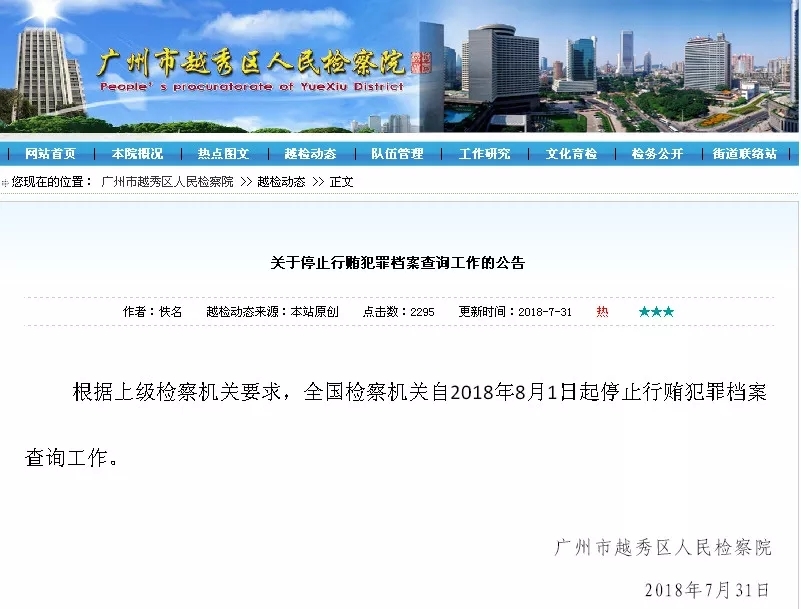 7月31日,浙江和廣東的相關政府單位網站、檢察院網站、招投標網發布消息:根據上級檢察機關要求,自2018年8月1日起停止行賄犯罪檔案查詢工作。