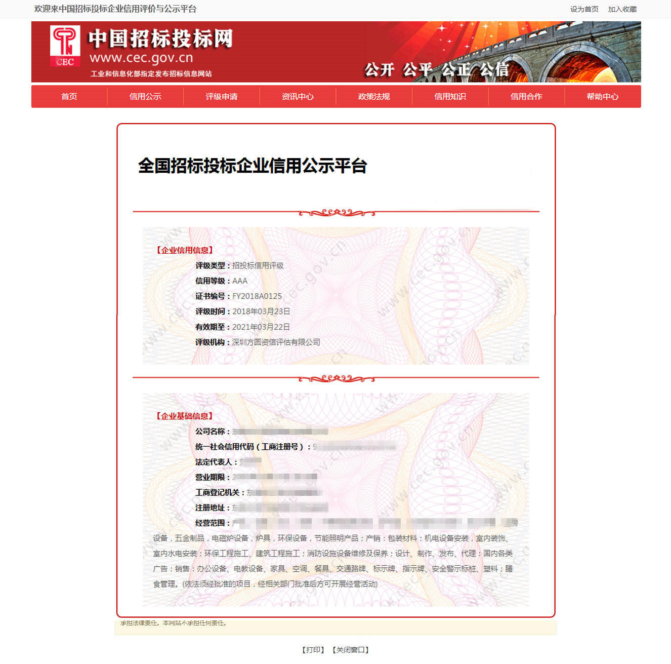 作為第三方招投標信用評估機構,深圳方圓資信評估有限公司(簡稱“方圓資信”)擁有自主制訂的“招投標行業企業信用評價標準”(標準號:Q/FY CE001-2017),已獲得深圳市標準技術研究院備案通過,出具的信用報告在工業和信息化部指定發布招標信息網站——中國招標投標網進行公示。截止目前,方圓資信擁有3名國家高級信用管理師(國家職業資格一級)專業團隊,已為幾百家投標企業提供信用評級服務。