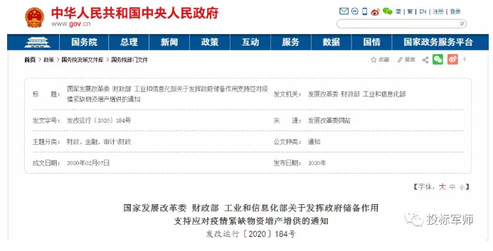 黨中央、國務院高度重視新型冠狀病毒感染肺炎疫情防控工作,把疫情防控工作作為當前最重要的工作來抓。為貫徹落實習近平總書記關于加強疫情防控工作的重要指示和中央政治局常委會會議精神,根據中央應對新型冠狀病毒感染肺炎疫情工作領導小組會議精神和國務院常務會議有關部署,全力保障醫(yī)療防護緊缺物資供應,迅速提高疫情防控保障能力,堅決打贏疫情防控阻擊戰(zhàn),現就發(fā)揮政府儲備作用支持應對疫情緊缺物資增產增供有關事項通知如下:
