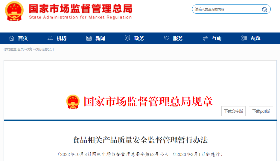 2022年10月8日國家市場監督管理總局令第62號公布《食品相關產品質量安全監督管理暫行辦法》,加強食品相關產品質量安全監督管理。